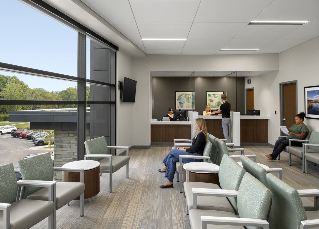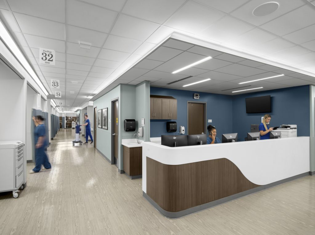 Pulse Design Group, a trusted partner to both organizations, led the reprogramming and design efforts in tandem with ongoing construction to ensure the facility reflected the new operational model and patient experience standards. The first floor encompasses approximately 40,000 SF of primary care, physical therapy, and imaging. Departments are organized around a central lobby to minimize walking distances and create an intuitive patient flow. The onstage/offstage layout is supported by dual-entrance exam rooms, promoting flexible clinical collaboration while maintaining privacy and efficiency. The circulation framework was designed for future expansion to the northeast or west sides of the building, allowing continued adaptability as service lines evolve. The second floor houses a 30,000 SF ambulatory surgery center with ten operating rooms and 35 universal pre/post rooms. Designed to optimize workflows and streamline recovery, the center expands access to high-quality outpatient surgical care for the Olathe community and surrounding region.